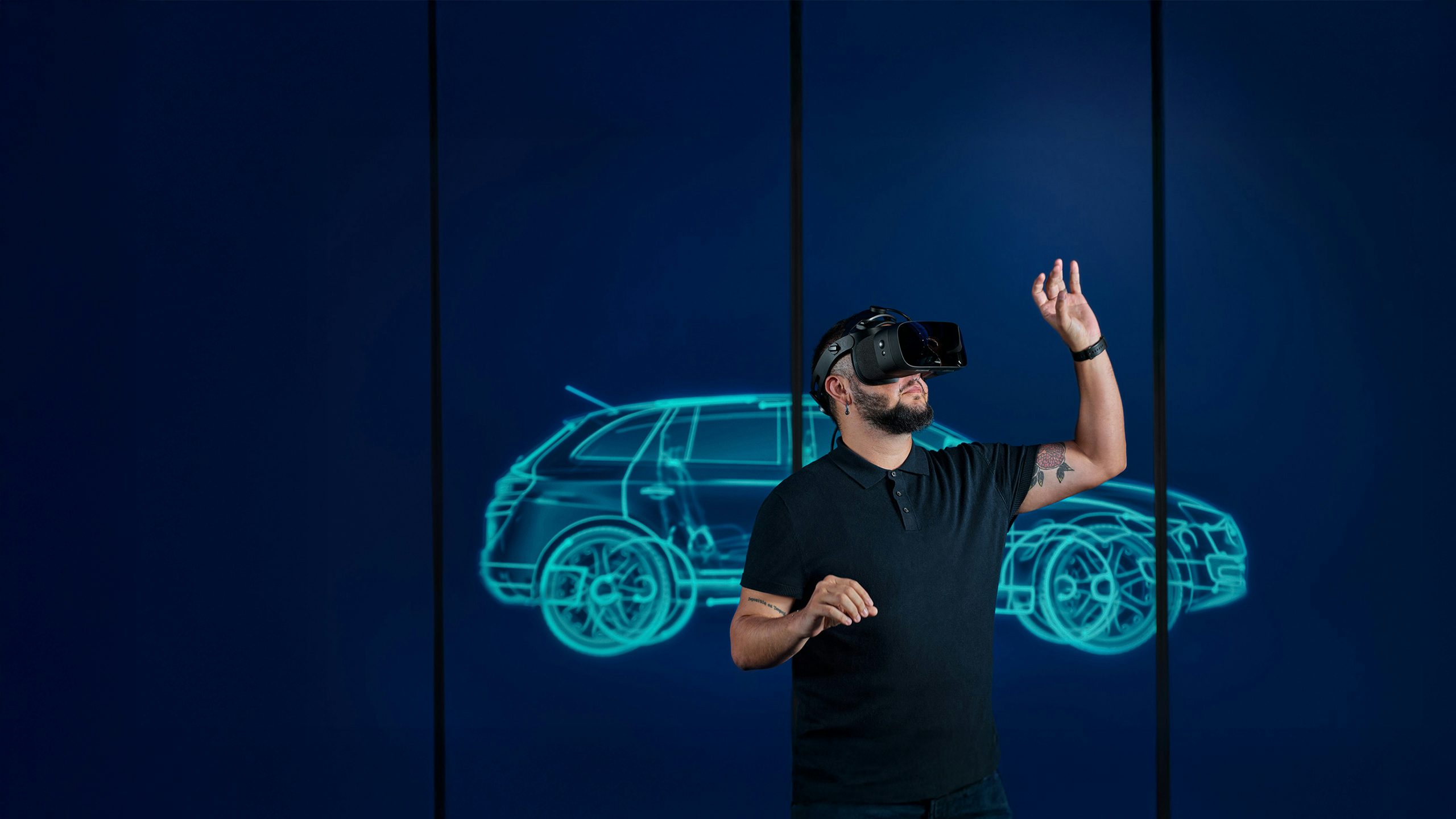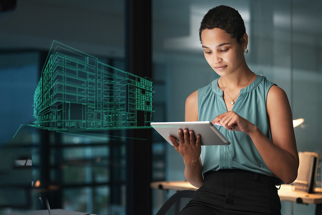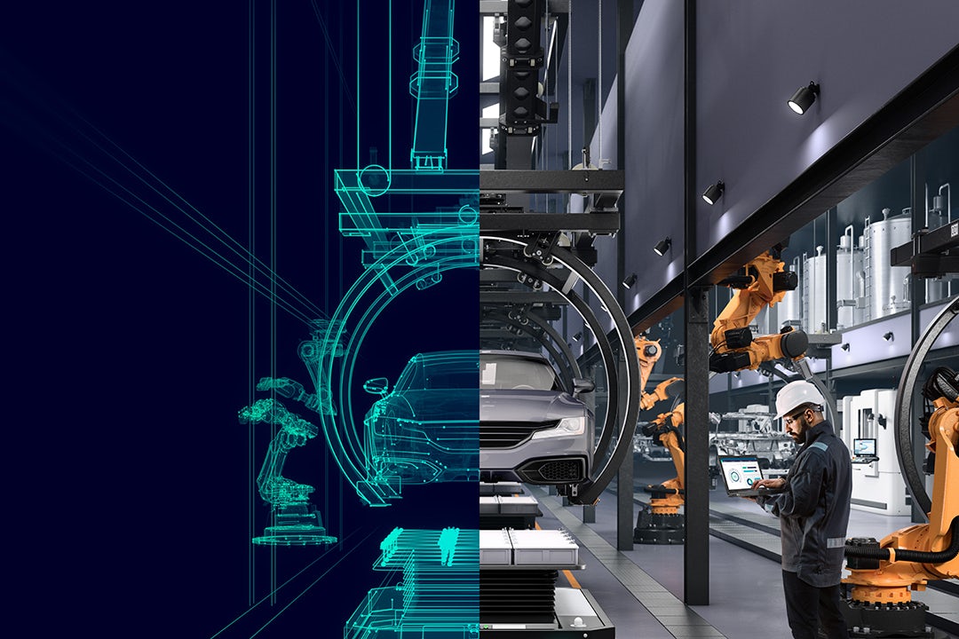 Siemens Xcelerator visual showing a futuristic interface with various data points and graphs.