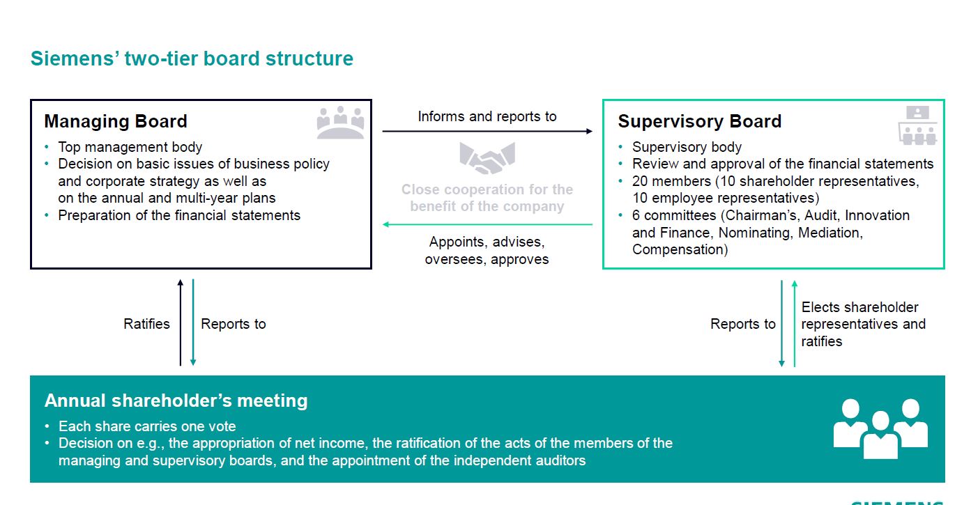 As a German stock corporation with registered offices in Berlin and Munich, Siemens is subject to German corporate law. Consequently, the Company has a two-tier management and oversight structure consisting of a Managing Board and a Supervisory Board (two-tier board structure).